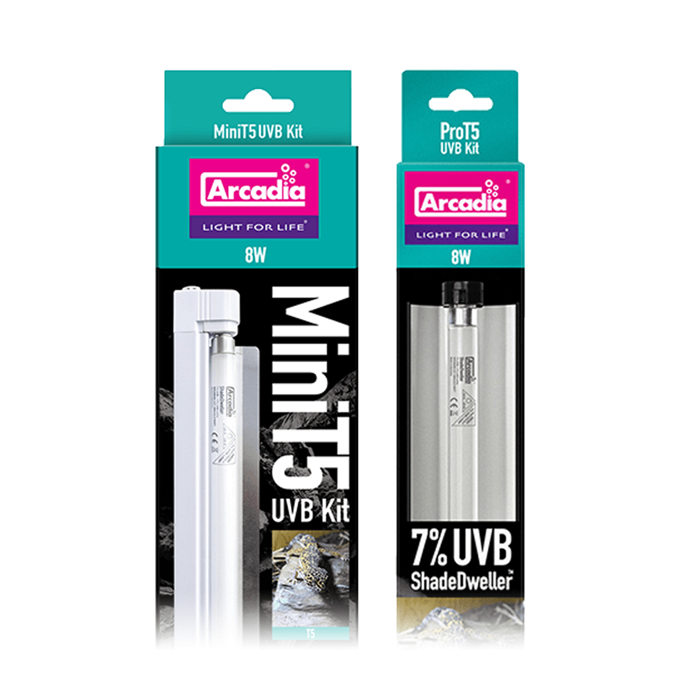 Arcadia Shade Dweller Kits come in two size options, the Pro T5 and Mini T5, both coming with an 8W ShadeDweller bulb. The only difference between each kit is the size of the bulb and the kit as a whole. Both kits include a fitting kit, reflector and can act as dedicated lighting systems for standard-sized enclosures, however, the Pro T5 UVB kit is better suited to a large wooden vivarium while the Mini T5 is better for a smaller glass vivarium.